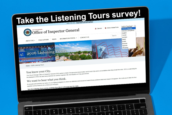 The City of Chicago Office of Inspector General (OIG) works to make City government better and to hold City actors accountable when they break the rules. If you have information about misconduct, waste, abuse, or mismanagement relating to City officials, City employees, or contractors and subcontractors providing goods or services to the City, or suggestions to improve City government, report it to OIG.